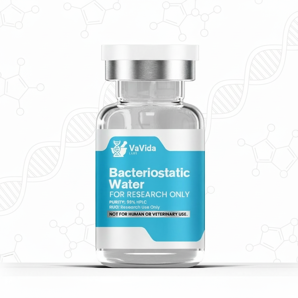 VaVida Labs Sterile bacteriostatic water with 0.9% benzyl alcohol for peptide reconstitution. Prevents contamination, maintains stability, and included free with all VaVida Labs orders.